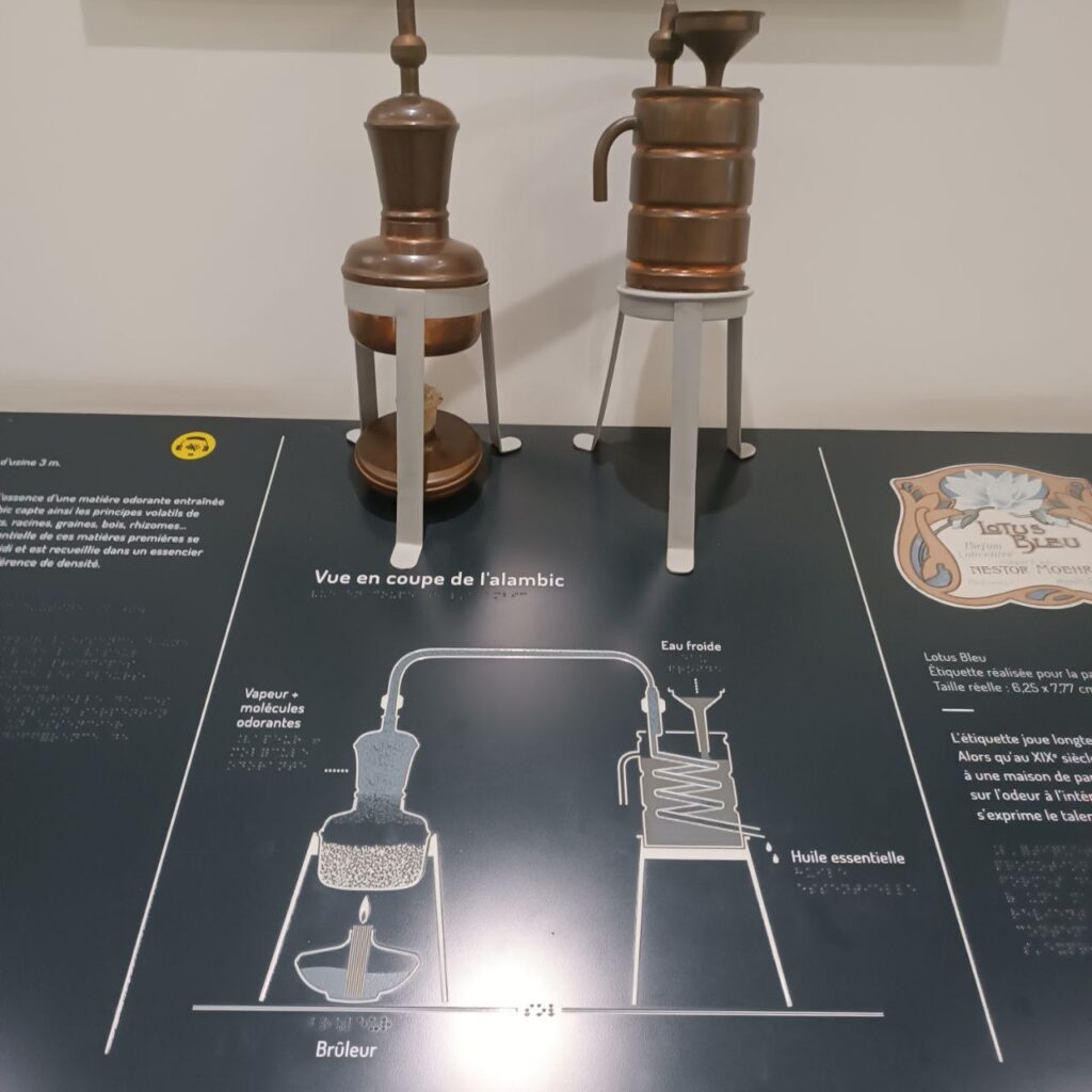 Ce que j’ai particulièrement apprécié au musée, ce n’est pas d’apprendre la distillation — une technique que je connais bien depuis mes études en pharmacie et cosmétique naturelle — mais de voir comment elle est présentée. Plusieurs alambics de différentes époques et tailles sont exposés, permettant de visualiser concrètement le passage de la vapeur d’eau à travers les plantes et la récupération des essences. C’est une pédagogie visuelle très parlante, qui peut vous intéresser si vous en voulez savoir plus sur la fabrication des huiles essentielles et l’évolution de cette technique au fil du temps.