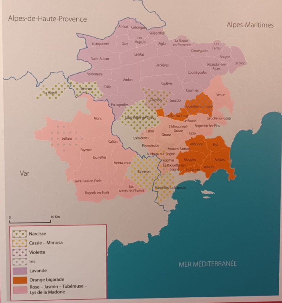 Sur la carte suivante, vous pouvez également observer d’autres plantes ainsi que la répartition de leurs cultures autour de Grasse. On associe souvent l’image de la lavande à toute la Provence. Pourtant, Grasse se situe à une altitude trop basse par rapport au niveau de la mer. Pour cultiver la lavande, il faut au minimum 600 m d’altitude, ce que l’on trouve plutôt dans le département voisin des Alpes-de-Haute-Provence.